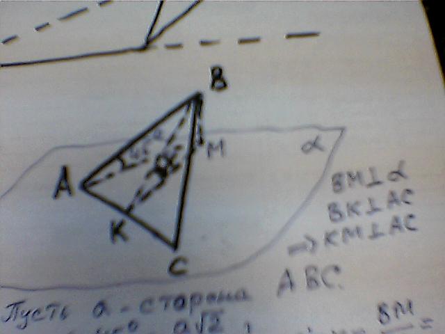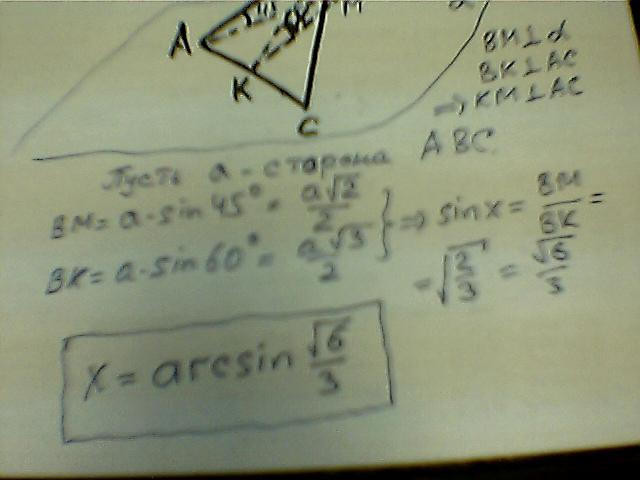 Треугольник АВС - равносторонний. Сторона АВ наклонена под углом 45 градусов к плоскости альфа, а сторона АС лежит в плоскости альфа. Под каким углом наклонена плоскость треугольника АВС к плоскости альфа?