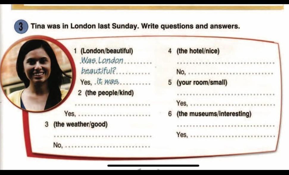 Tina was in london last sunday. write and answers. 1 London /beautiful .was London beautiful?.yes ,It was. 2 the people/ mind. Yes..... 3 the weather/ good .No...... 4 the hotel/ nice . No...... 5 your room/ small. Yes...... 6 the museum / interesting. Yes......cine ma ajuta va rog frumos! пж помогите