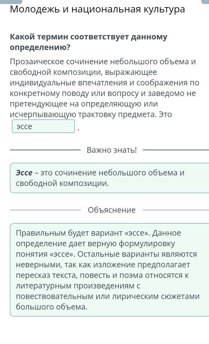 Прозаическое сочинение небольшого объема и свободной композиции, выражающее индивидуальные впечатления и соображения по конкретному поводу или вопросу и заведомо не претендующее на определяющую или исчерпывающую трактовку предмета. Это