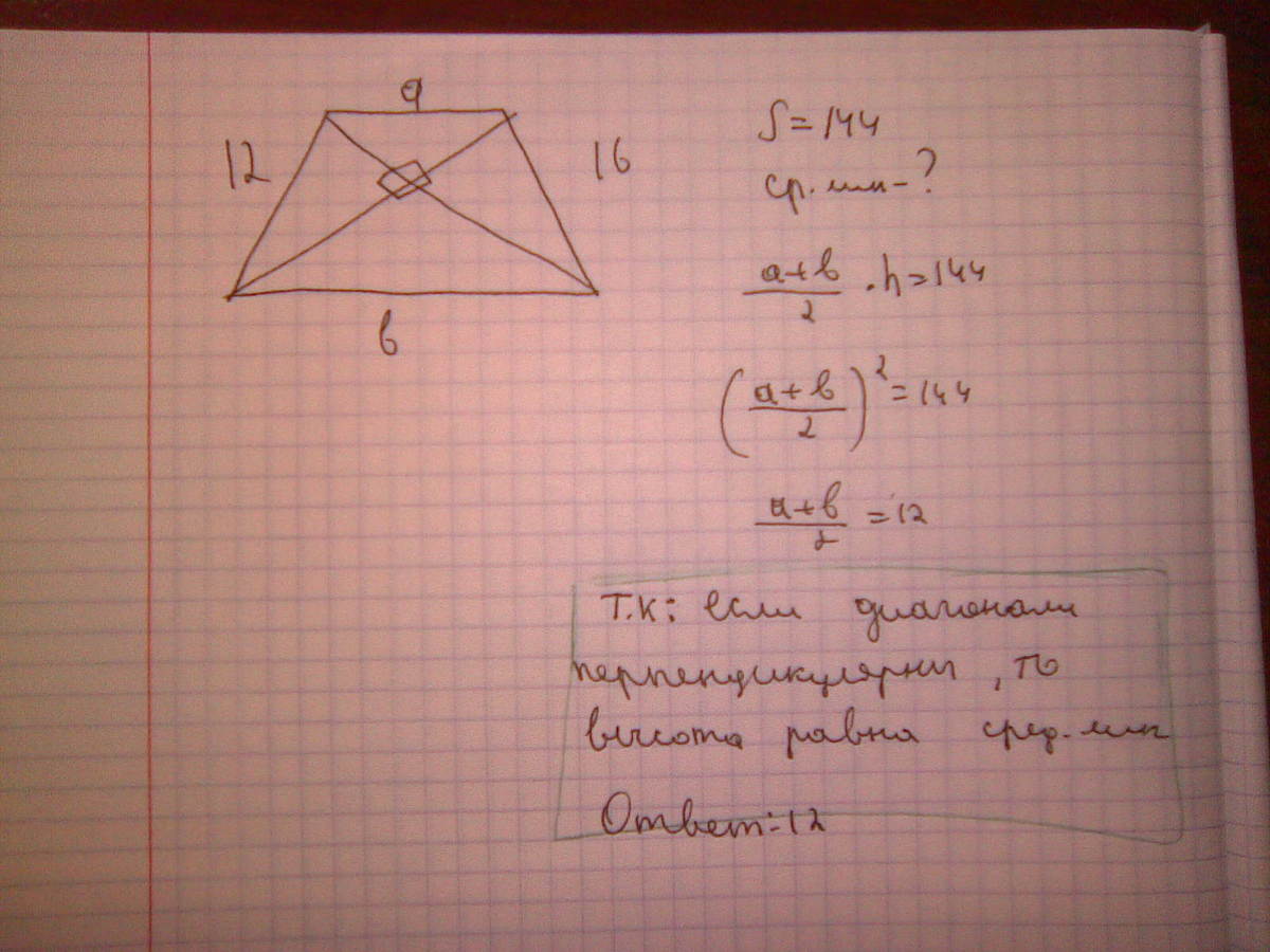 Боковые стороны трапеции равны 12 и 16,а содержащие их прямые взаимно перпендикулярны, площадь трапеции равна 144. Найти среднюю линию