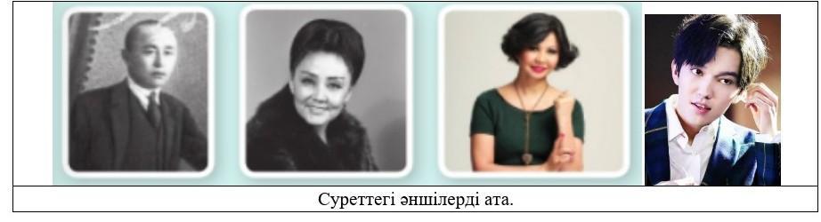 1 – Әміре Қашаубаев, 2 – Бибігүл Төлегенова, 3 – Роза Рымбаева, 4 – Димаш Құдайбергенов