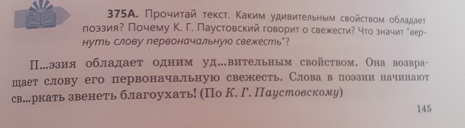 Ответ:Поэзия обладает одним удивительным свойством. Она возвращает слово первоначальную свежесть. Слова в поэзии начинают, сверкать, звенеть, благоухать!