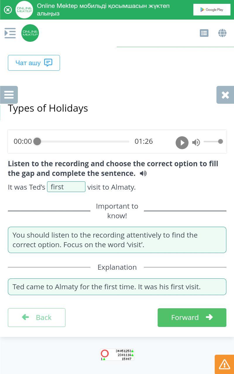 Types of Holidays Listen to the recording and choose the correct option to fill the gap and complete the sentence. It was Ted’s visit to Almaty.