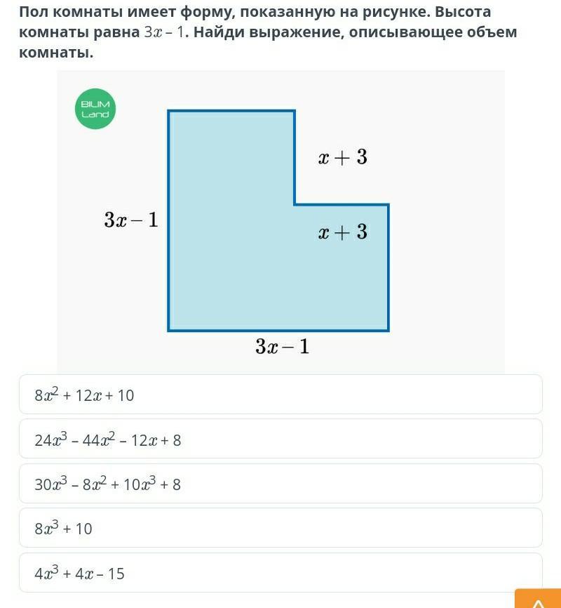 Пол комнаты имеет форму, показанную на рисунке. Высота комнаты равна 3x – 1. Найди выражение, описывающее объем комнаты.