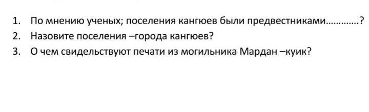 1)По мнению ученых, поселения, возникшие в эпоху кангюев, можно считать предвестниками городских поселений раннего Cредневековья. На юге Казахстана древние жители вели оседлый образ жизни. В долине реки Сырдарьи выращивали зерновые, огородно-бахчевые культуры.