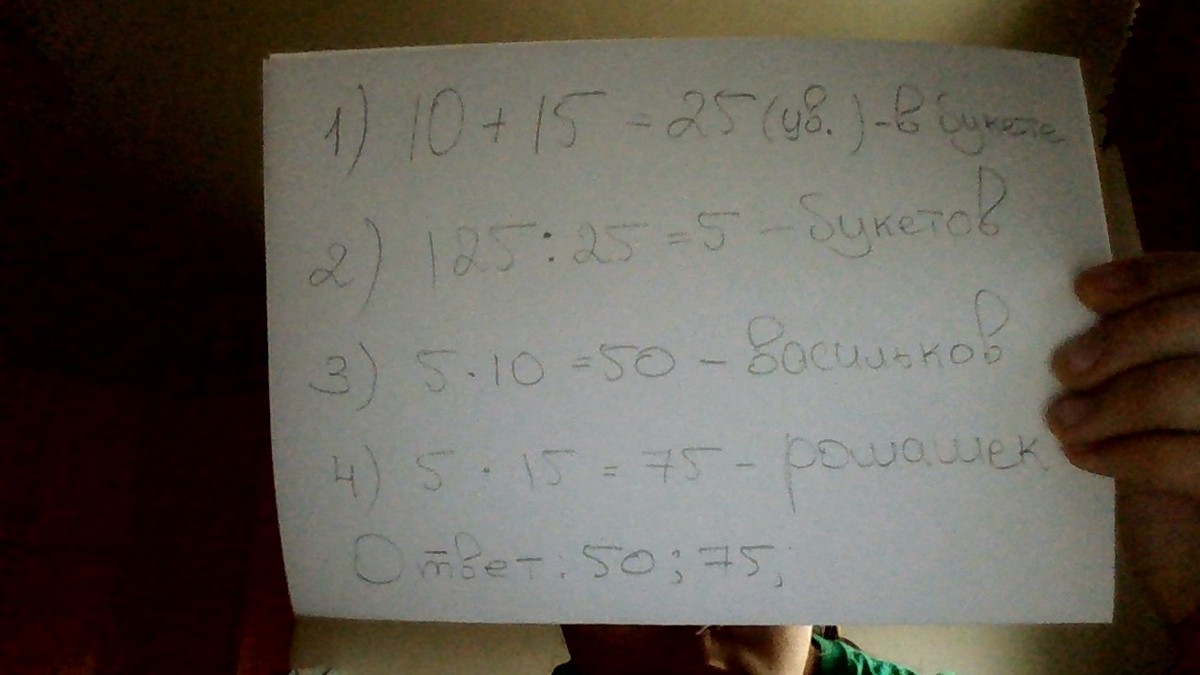 Девочка сделала несколько букетов из ромашек и васильков.В каждом букете 15 ромашек и 10 васильков.Сколько всего у нее ромашек и сколько васильков , если общее количество цветов 125?