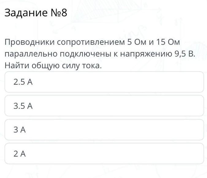Проводники сопротивлением 5 Ом и 15 Ом параллельно подключенык напряжению 9,5 В. Найти общую силу тока.