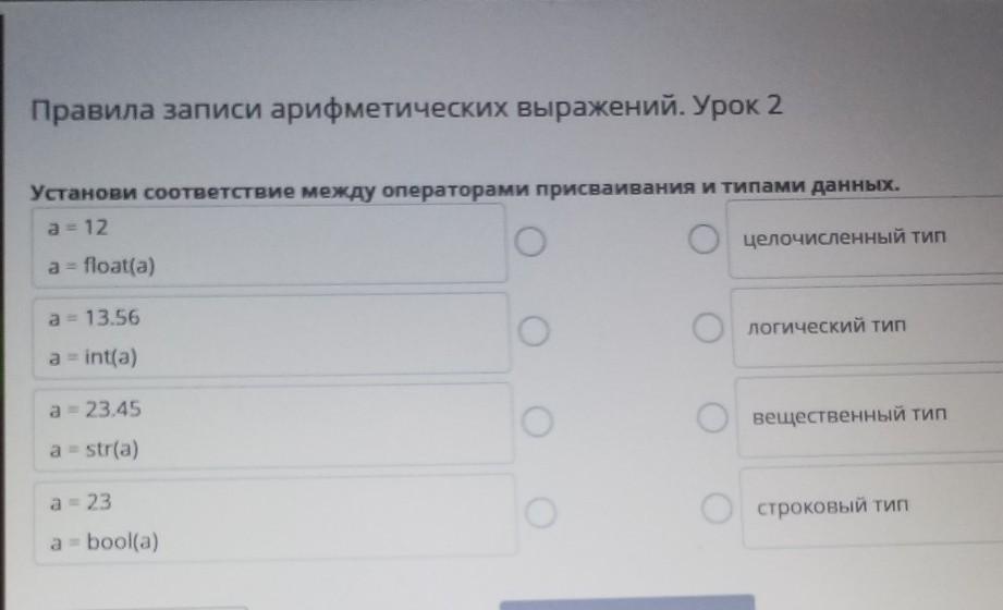 ответ: 1.а=float(14)-8 - 6.0 2.a= int(13.56)-27 - -14 3. a=str('45') - 45 4. a=23==21 - False