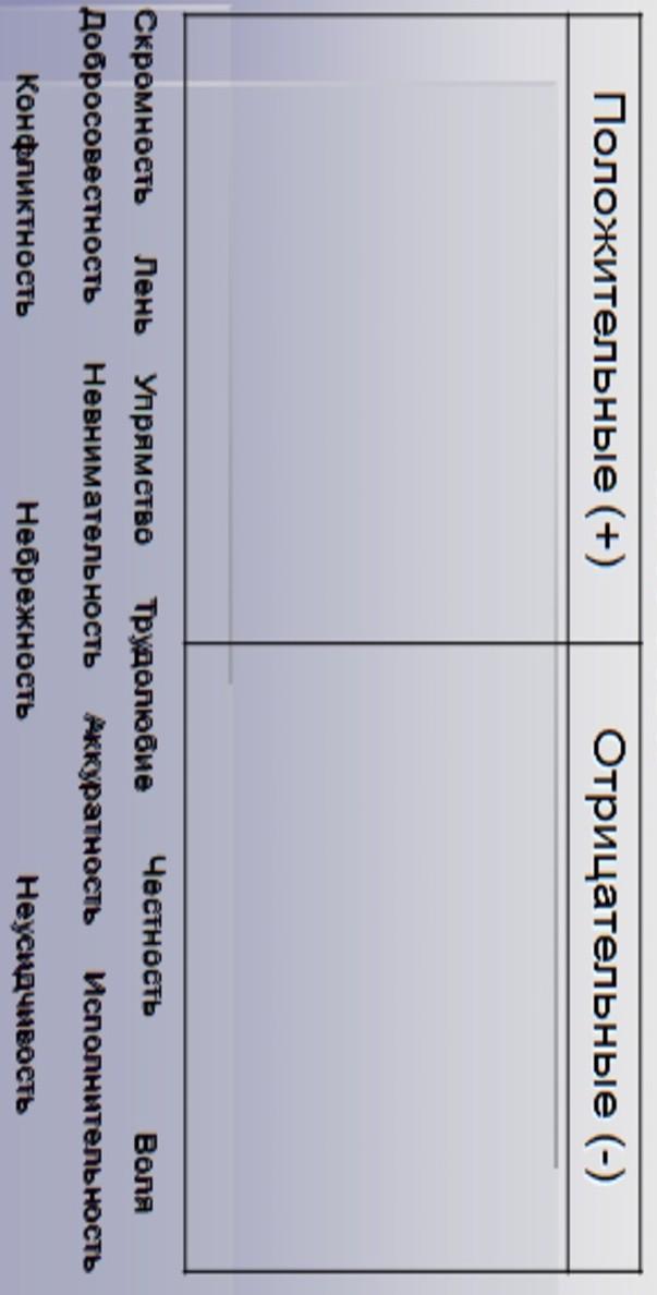 Положительные : трудолюбие , честность , добросовестность , аккуратность , исполнительность