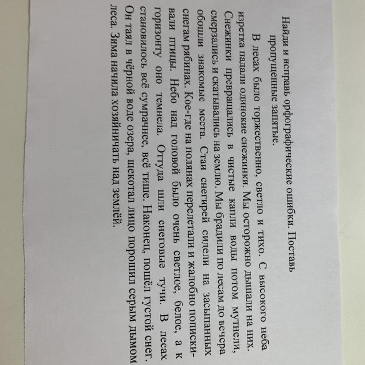 В лесах было торжественно, светло и тихо. С высокого неба изредка падали одинокие снежинки. Мы осторожно дышали на них. Снежинки превращались в чистые капли воды, потом мутнели, смерзались и скатывались на землю. Мы бродили по лесам до вечера , обошли знакомые места, Стаи снегирей сидели на засыпанных снегом рябинах. Кое где на полянах перелетали и жалобно попискивали птицы. Небо над головой было очень светлое, белое, а к горизонту оно темнело. Оттуда шли снеговые тучи. В лесах становилось всё сумрачнее, всё тише. Наконец пошёл густой снег. Он таял в чёрной воде озера, щекотал лицо, порошил серым дымом леса. Зима начала хозяйничать над землёй.