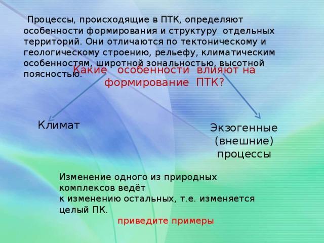 – зональные (внешние факторы, распределение солнечной энергии). Примером зональных природно-территориальных комплексов являются тундра, степи, тайга.