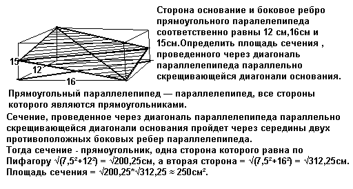 Сторона основание и боковое ребро прямоугольного паралелепипеда соответственно равны 12 см,16см и 15см.Определить площадь сечения , проведенного через диагональ параллелепипеда параллельно скрещивающейся диагонали основания.