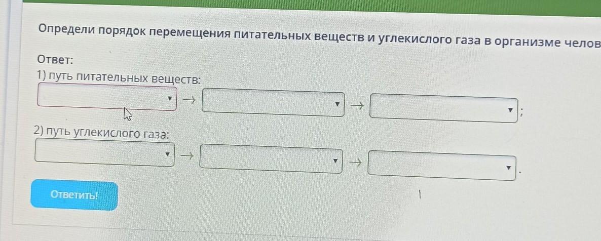Определи порядок перемещения питательных веществ и углекислого газа в организме чел