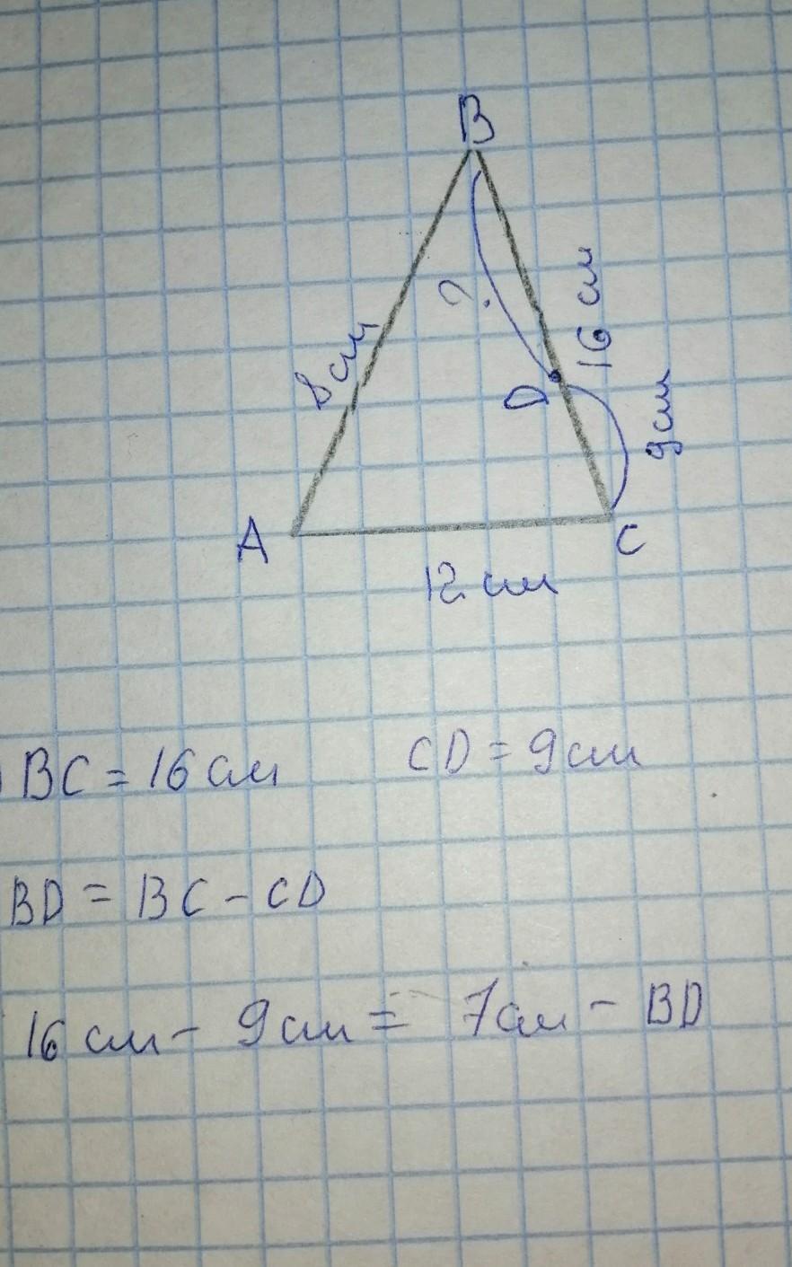 В треугольнике АВС известно, что АВ=8см, ВС=12см, АС=16см. На стороне АС отметели точку D так, что СD=9см. Найдите отрезок ВD