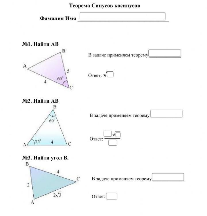 В задаче 1 и 3 применяем теорему косинусов, во второй теорему синусов