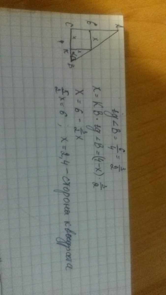 квадрат имеет с прямоугольным треугольником , катеты которого равны 6 и 4, общий угол. и одна из вершин квадрата лежит на гипотенузе. сторона квадрата равна???