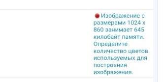 1024*860=880640 точек занимает все изображение. переводим килобайты в байты 645*1024=660480 байт или 5283840 бит (байты умножили на 8). Теперь делим объем битов на количество точек изображения 5283840/880640=6 бит цвета на точку. Шестью битами можно закодировать 64 цвета.