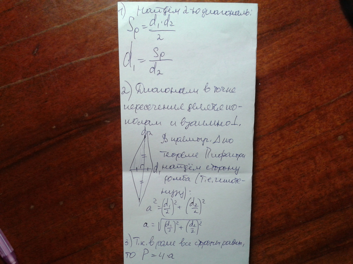 Если известно 1 диагональ и площадь то составь обратную формулу
