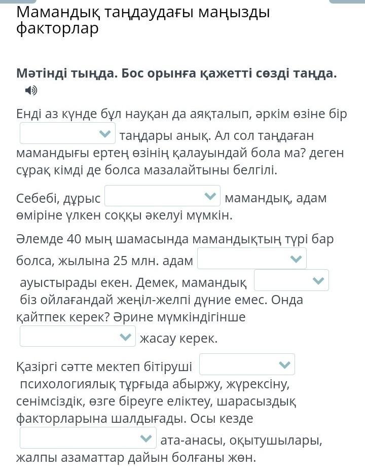25млн.адам мамандық ауыстырады екен.Демек,мамандық таңдау жеңіл-желпі дүние емес.Онда қайтпек керек?Әрине мүмкіндігінше таңдау жасау керек.Қазіргі кезде мектеп бітіруші түлектер психологиялық тұрғыда әбыржу,жүрексіну,сенімсіздік,өзге біреуге еліктеу,шарасыздық факторларына шалдығады.Осы кезде түлектердің ата-аналары,оқытушылары,жалпы азаматтар дайын болғаны жөн.