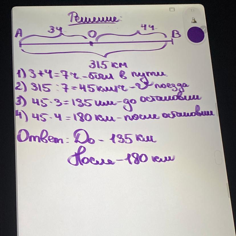 Помогите пожалуйста ,срочно!!! Задача : Товарный поезд прошел 315 км. Он был в пути до остановки 3 ч и после остановки 4 с. Сколько километров прошел поезд до остановки и сколько после, если он шел с одинаковой скоростью?