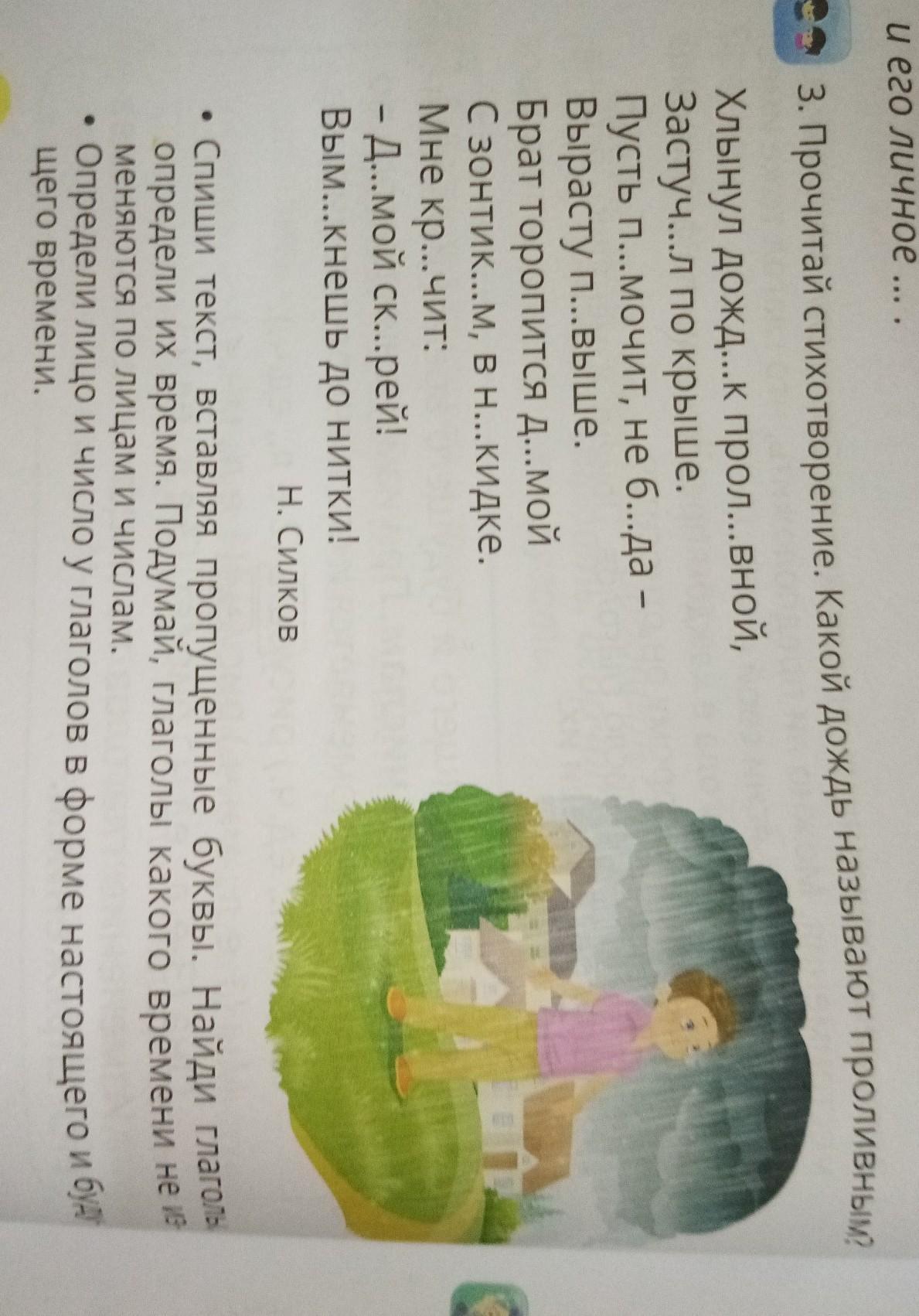 Пусть помочит(б.вр.,3 лицо,ед.число),не беда- Вырасту(б.вр.,1 лицо,ед.число) повыше. Брат торопится(н.вр.,3 лицо,ед.число) домой С зонтиком,в накидке. Мне кричит(н.вр.,3 лицо,ед.число): -Домой скорей! Вымокнешь(б.вр.,2 лицо,ед.число) до нитки!