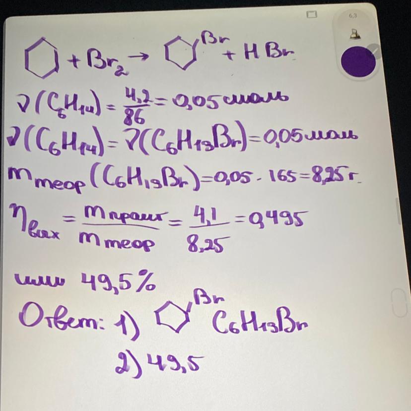 ДАМ 30 БАЛЛОВ При бромировании 4,2 г циклогексана при нагревании было получено 4,1 г органического вещества. Определите формулу образованного органического продукта и его массовую долю выхода реакции