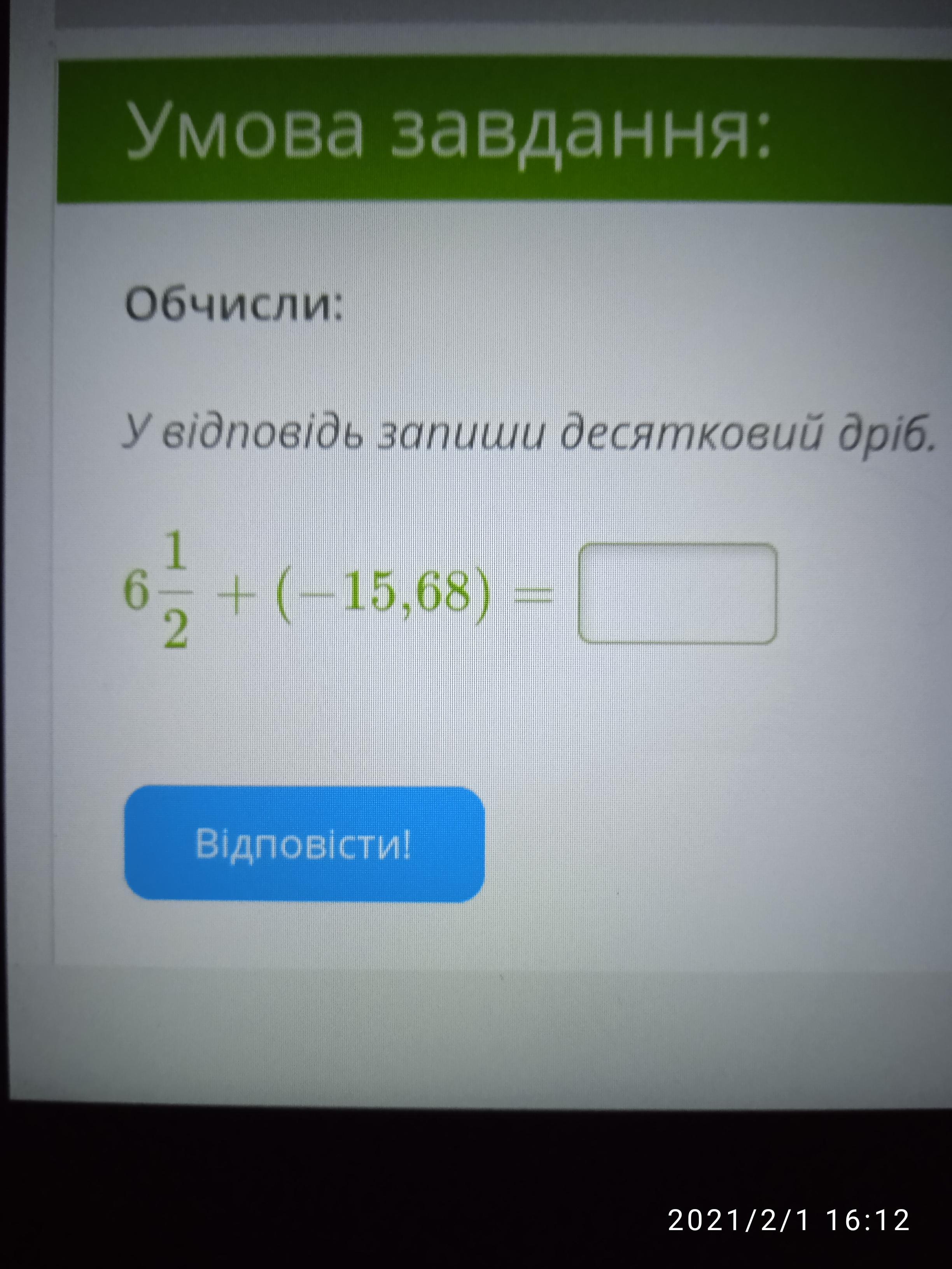 6 1/2 + (-15,68) = 6,5 - 15,68 = -9,18