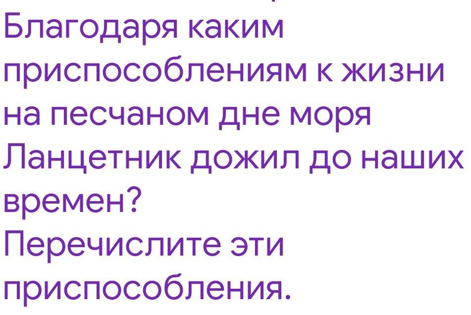 Ответ: Ланцетник дожил до наших времен благодаря приспособлениям к жизни на песчаном дне наличие упругой хорды, довольно большая масса мышц, лентовидный плавник и уплощенное с боков тело способствуют быстрому зарыванию в грунт, околожаберная полость защищает жабры от засорения.