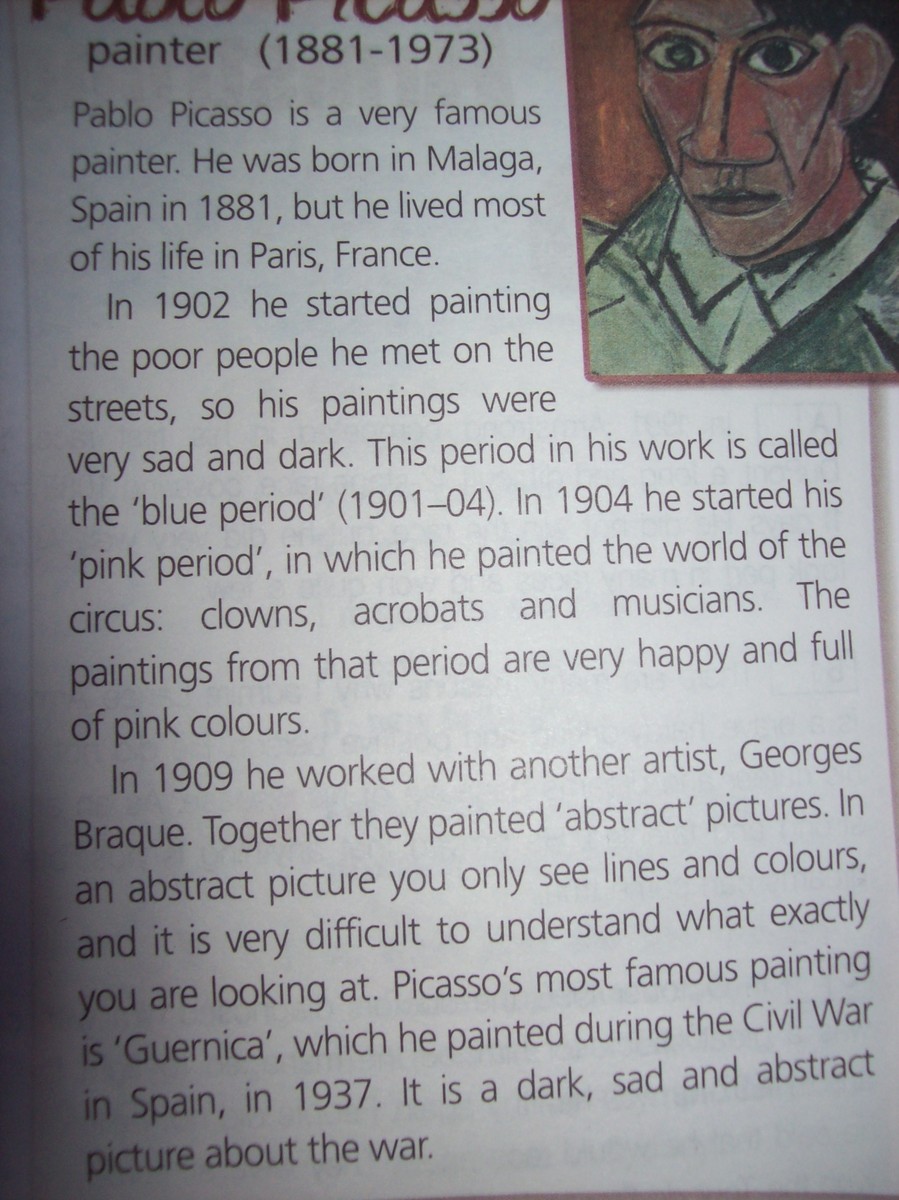 Пабло Пикассо очень знаменитый художник. Он родился в Малаге, в Испании в 1881 году, но большую часть жизни он жил в Париже, во Франции. В 1902 году он начал рисовать бедных людей, которых он встречал на улицах, таким образом, его картины были очень грустными и тусклыми. Этот период называется "голубым"периодом(1901-1904гг). В 1904 году он начал его "розовый" период, в котором он рисовал мир цирка: клоунов, акробатов и музыкантов. Рисунки из этого периода очень счастливые и полотна розового цвета. В 1909 году он работал с другими художниками, Джорджем Браком. Вместе они рисовали абстрактные рисунки. В абстрактном рисунке ты видишь только штрихи и цвета, и нелегко понять, на что точно ты смотришь. Самый известный рисунок Пикассо "Джерника", которую он рисовал в течении Севильской войны в Испании, в 1937 году. Это темная, грустная и абстрактная картина о войне.