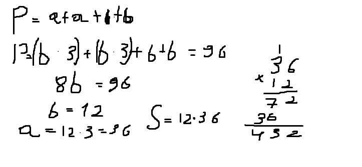Периметр 96см а одна из сторон длиннее другой в 3 раза. Вычислите площадь прямоугольника