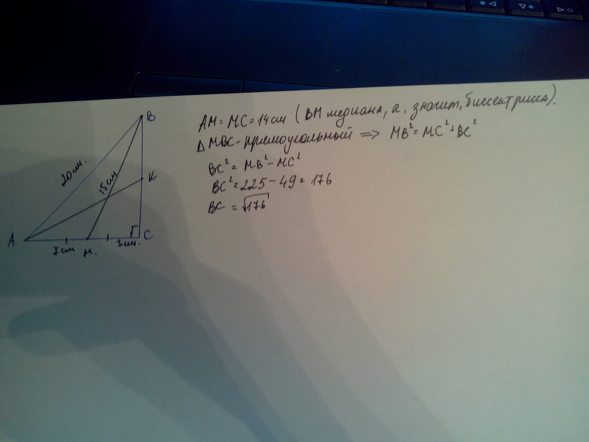2. В прямоугольном треугольнике ABC на катете AC взята точка M. Найдите катет BC, если AB=20 см, AM=7 см, BM= 15 см.