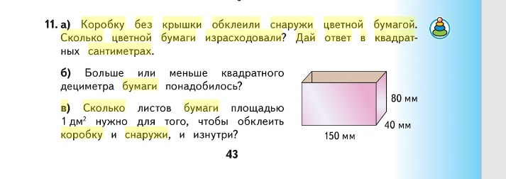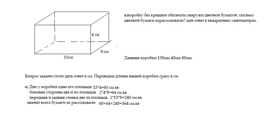 Коробку без крышки обклеили снаружи цветной бумагой .Сколько цветной бумаги израсходовали?Дай ответ в квадратных сантиметрах . Данные коробки 150мм 40мм 80мм. Ребята нужно срочно.
