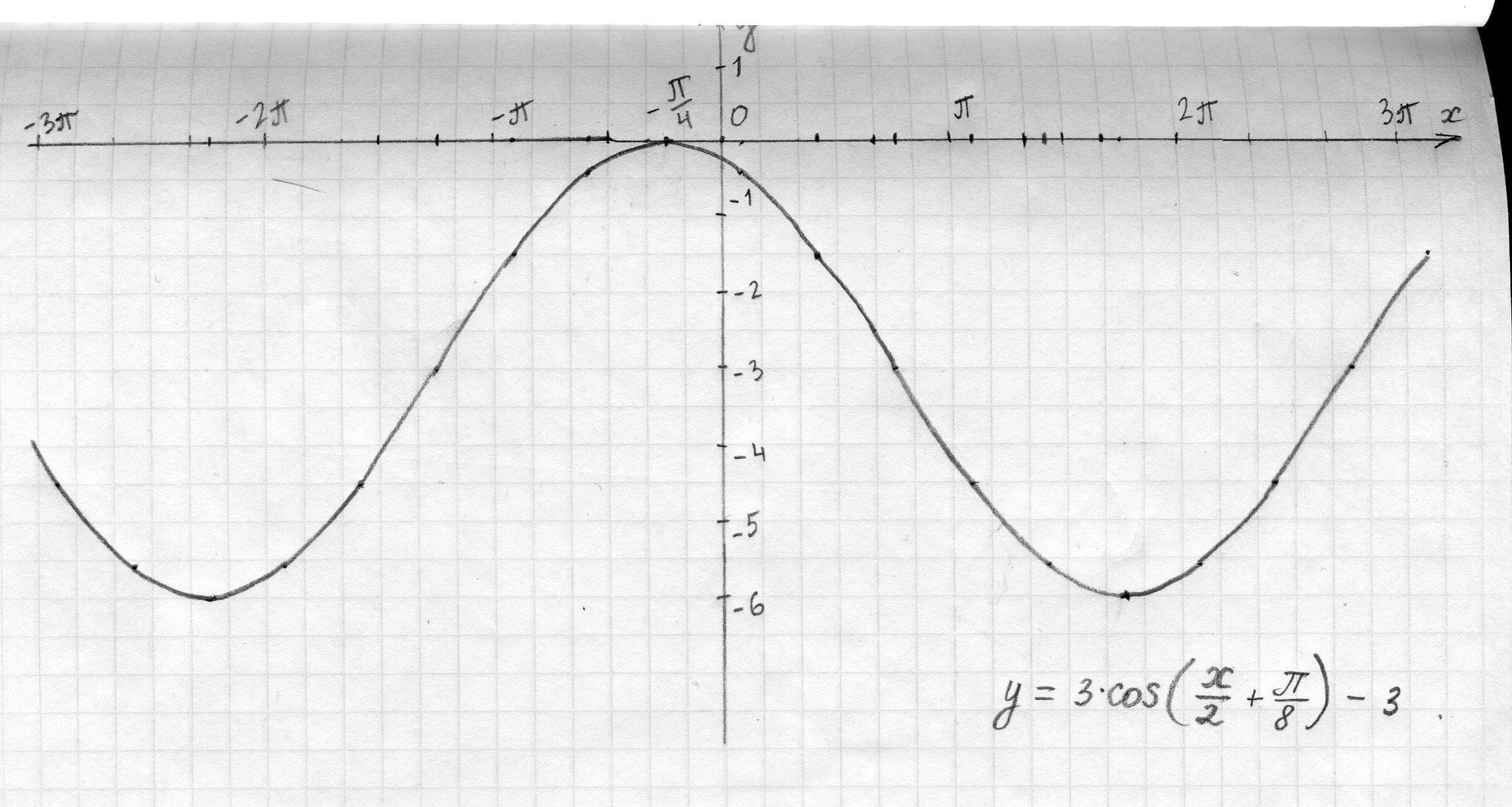 Y=3cos (x/2+pi/8)-3 как решить этот косинусоид? Нужно решить и построить график. Да нужно построить график функцыи