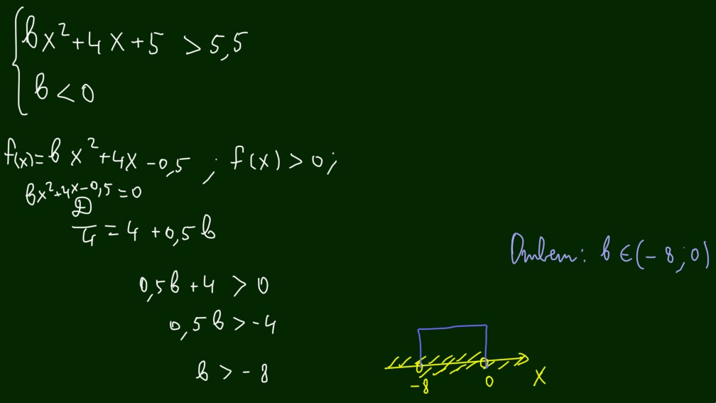 найдите все значения b при каждом из которых функция f(x)=bx^2 +4x+5 имеет наибольшее значение и это значение больше 5,5