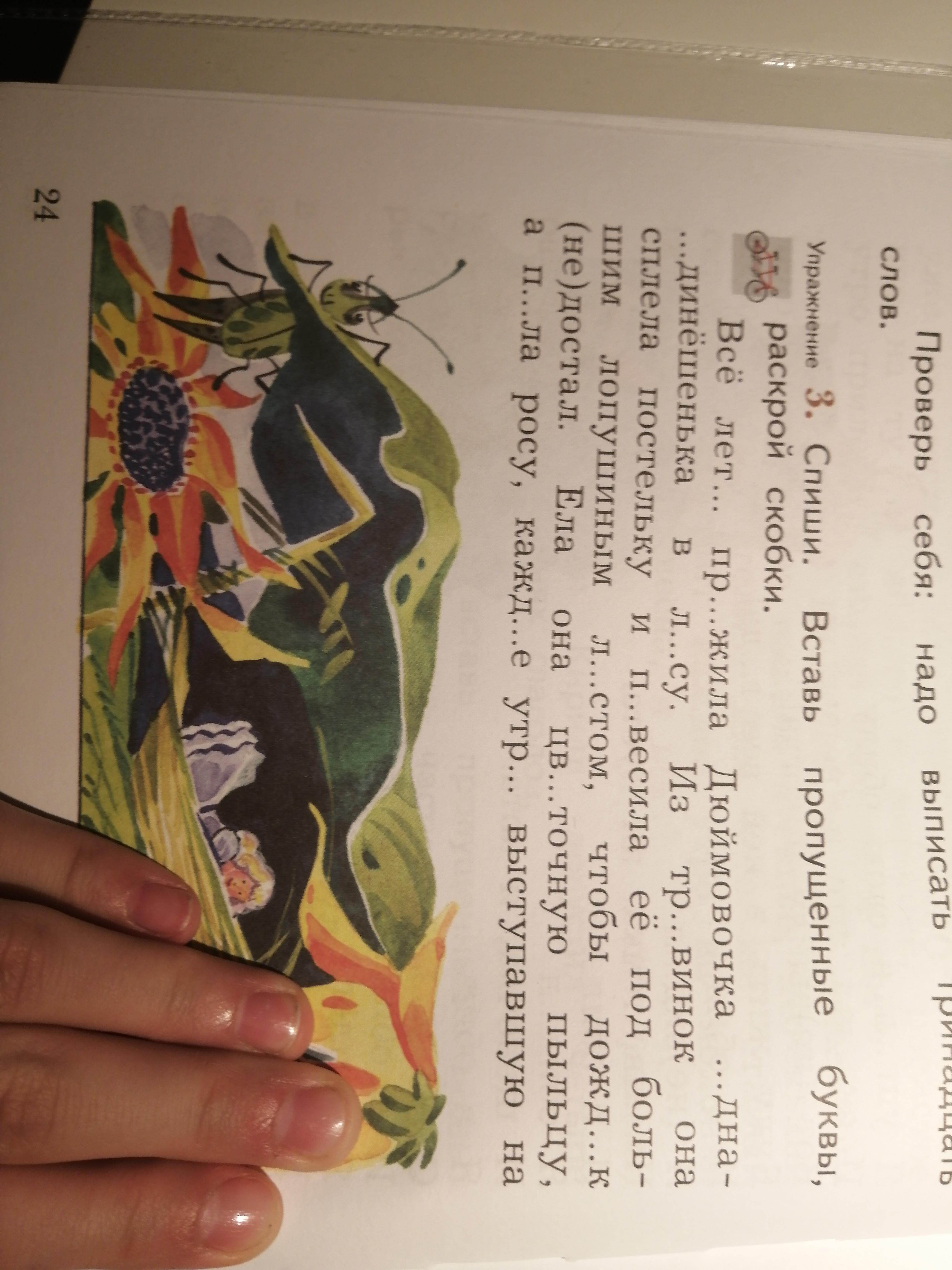 Все лето прожила Дюймовочка одна-одинешенька в лесу. Из травинок она сплела постельку и повесила ее под большим лопушиным листом,чтобы дождик не достал. Ела она цветочную пыльцу ,а пила росу ,каждое утро выступавшую на листьях трав.Так прошли лето и осень ,настала зима-долгая,холодная зима.Разлетелись все птицы,что пели для неё так дивно,увяли цветы и деревья ,а большой лопушиный лист,под которым жила Дюймовочка,пожелтел,засох и свернулся в трубку.