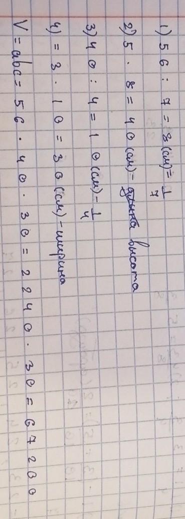 3) V = 40 * 30 * 56 = 67200 (см³)