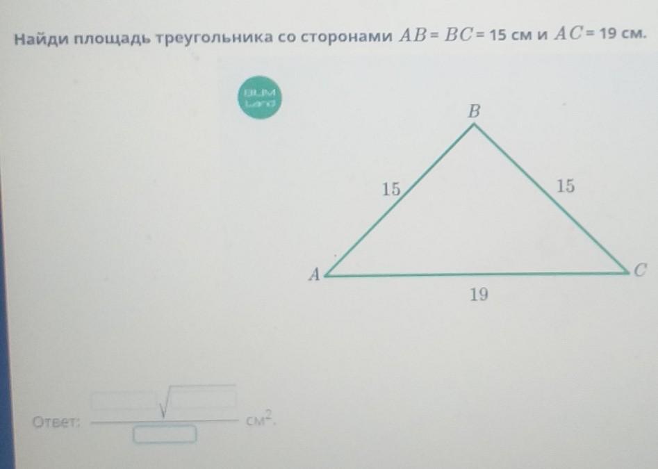 Найди площадь треугольника со сторонами AB = BC= 15 см и АС= 19 см.