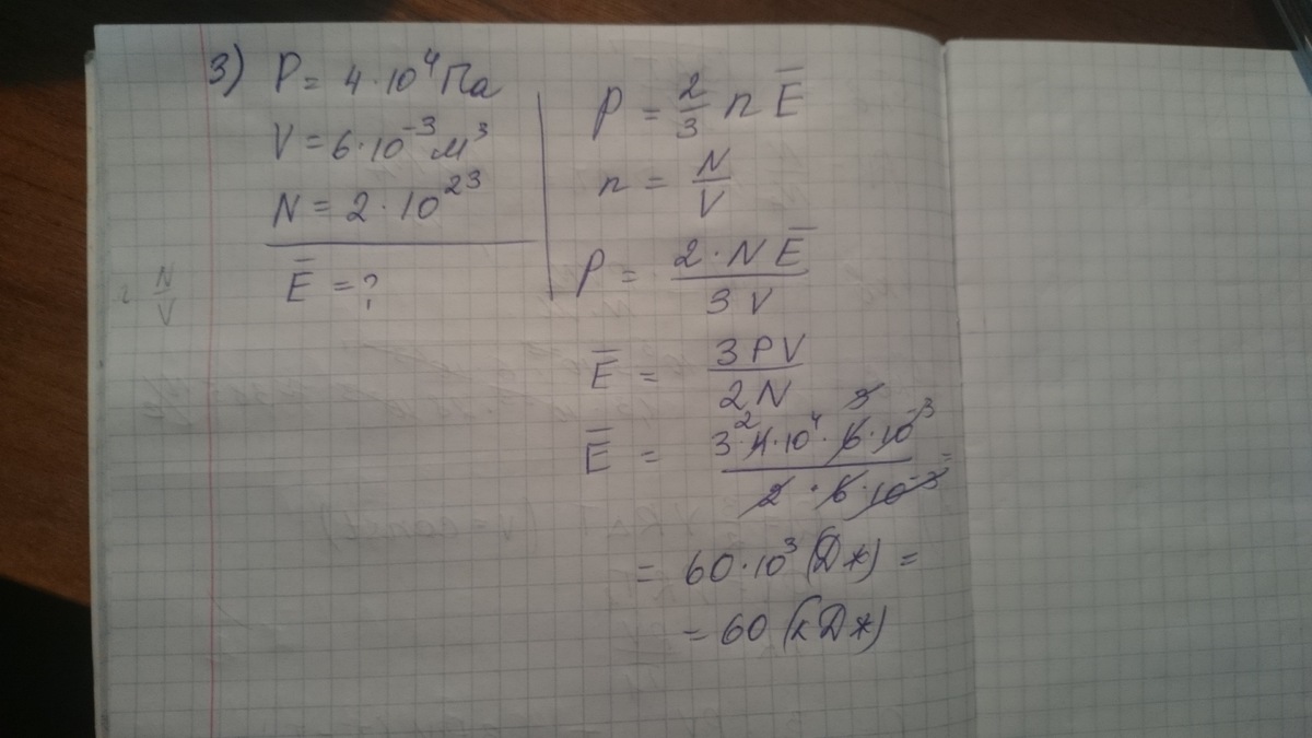 3.Какова средняя кинетическая энергия молекул газа, если его плотность 40 кПа, а в объёме 6 литров содержится 2*10^23 молекул.