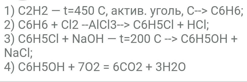 1.)C2H2-t=450C°,актив.уголь, C->C6H6.
