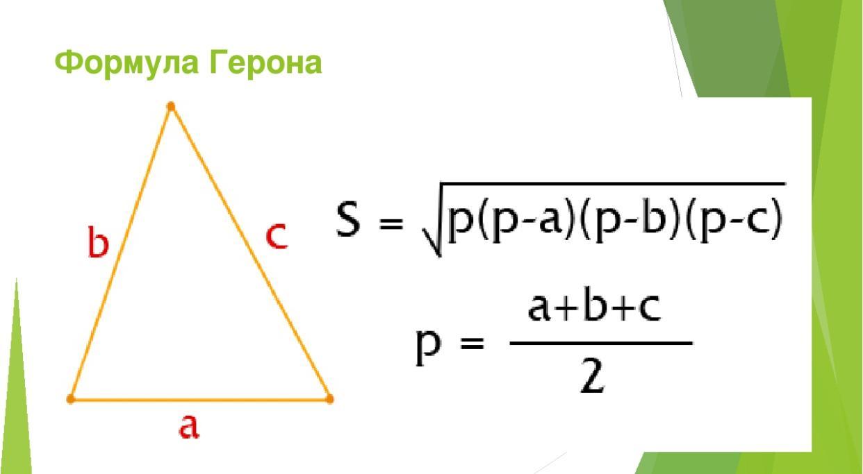 Вычисления ведутся при помощи формулы Герона и полупериметра.