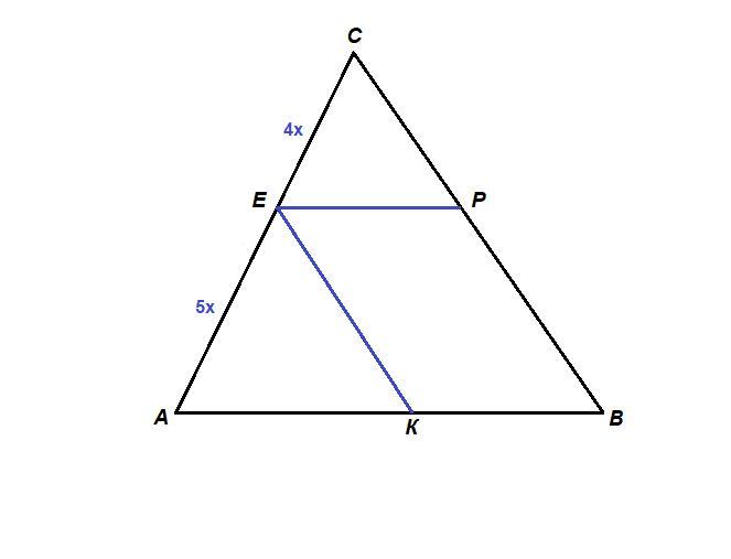 В треугольнике ABC через точку E , которая делит сторону AC в отношении 5:4 , считая от вершины A , проведены прямые, параллельные AB и BC . Прямая, параллельная AB , пересекает BC в точке P , а параллельная BC пересекает AB в точке K . Известно, что AB=45
