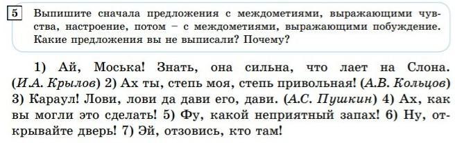 2.упр 5 стр 48 Выпишите сначала предложения с междометиями, выражающими чувства, настроения, потом с междометиями, выражающие побуждение.