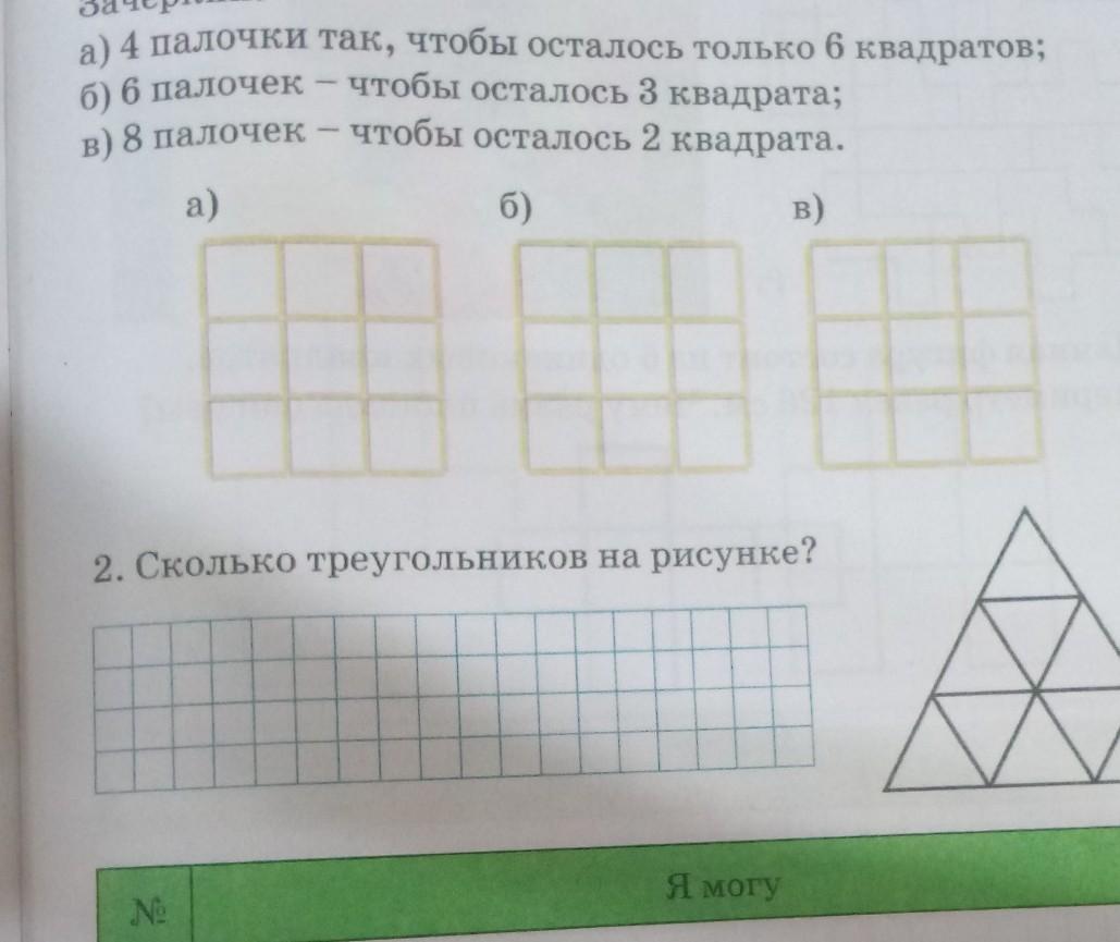 а) 4 палочки так, чтобы осталось только 6 квадратов;