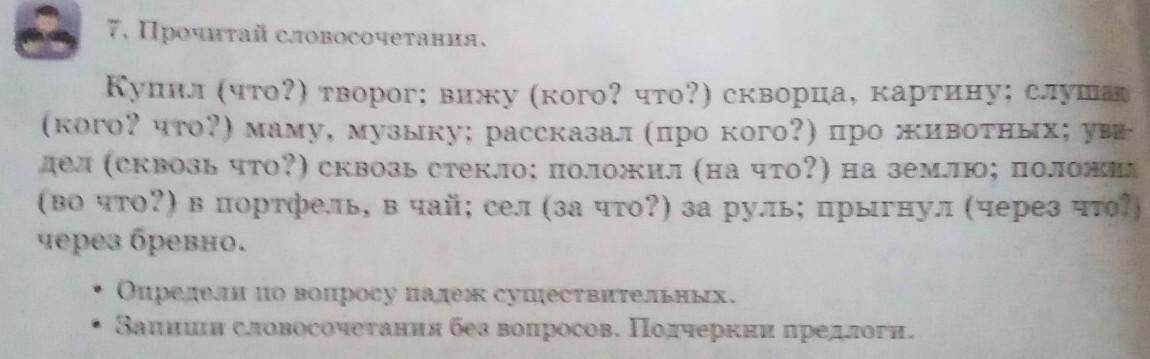 7. Прочитай словочетание. Определи по вопросу падеж существительных. Запиши словочетание без вопросов. Подчеркни предлоги.