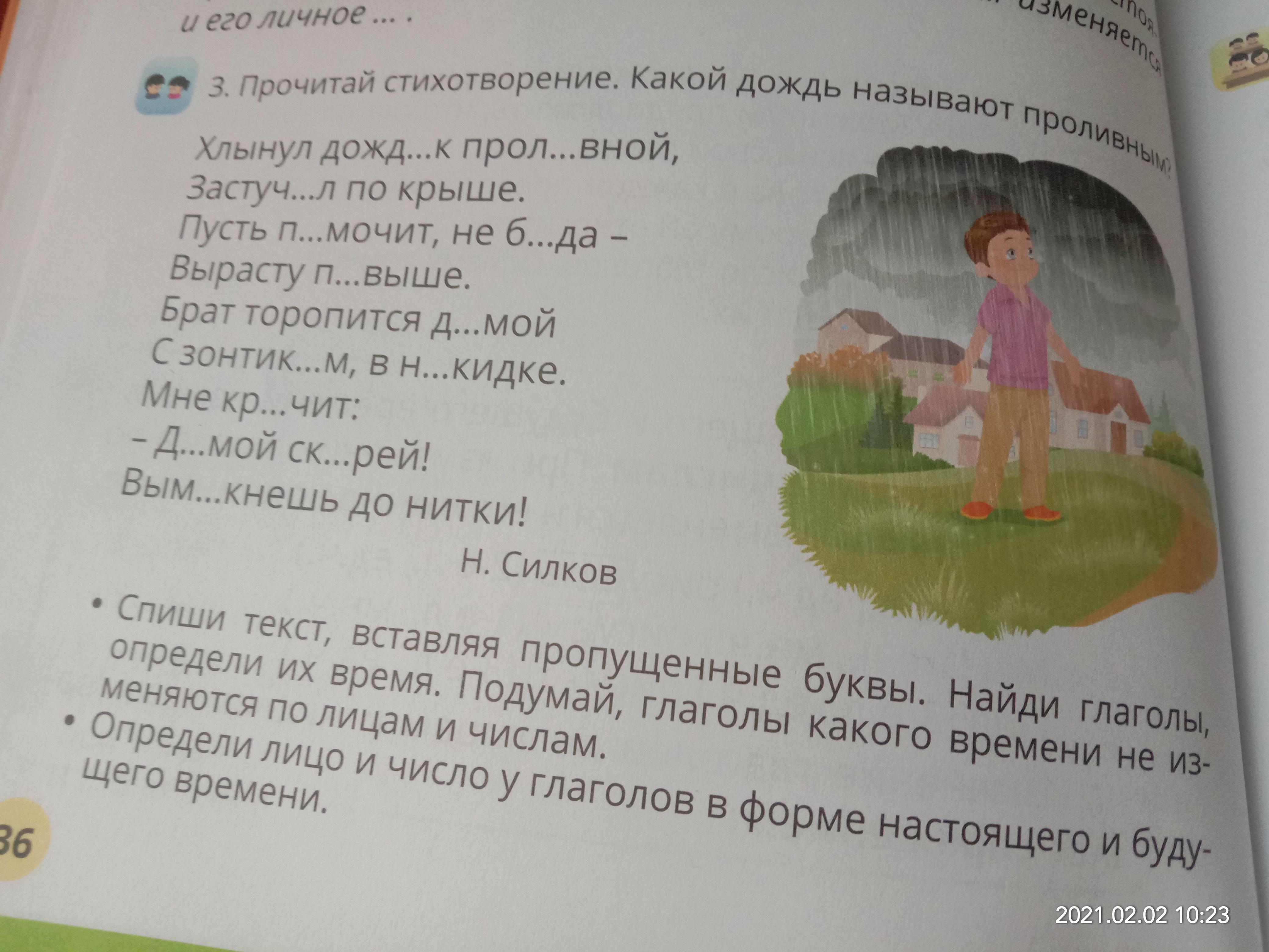 пропущенные буквы: дождик, проливной, застучал, помочит, беда, повыше, домой, зонтиком, накидке, кричит, домой, скорей, вымокнешь