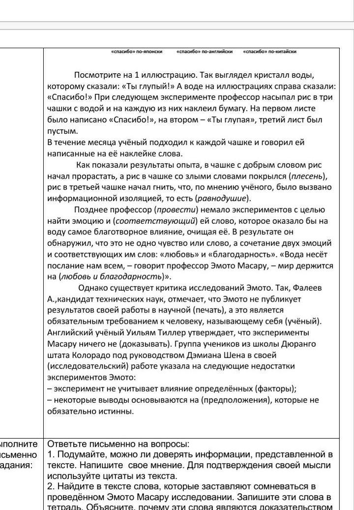 полните Ответьте вопросы: 1. Подумайте, можно ли доверять информации, представленной в тексте. Напишите свое мнение. Для подтверждения своей мысли используйте цитаты из текста. 2. Найдите в тексте слова, которые заставляют сомневаться в проведённом Эмото Масару исследовании. Запишите эти слова в тетрадь. Объясните, почему эти слова являются доказательством сьменно адания: