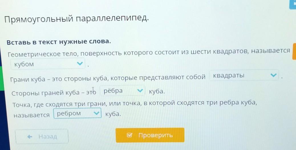 1). Кубом 2). Квадраты 3) Рёбра 4). Вершиной..