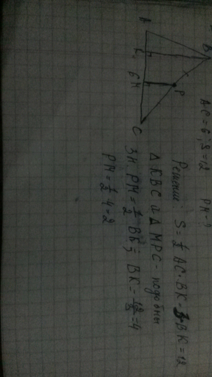 площадь треугольника ABC равна 12, AC=6 . точка P-середина стороны BC . найдите расстояние от точки P до стороны AC.
