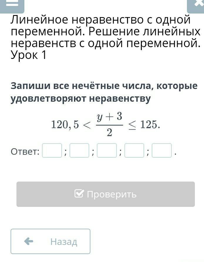 Запиши все нечётные числа, которые удовлетворяют неравенству 120, 5 < (y + 3)/2 <= 125 . Ответ: