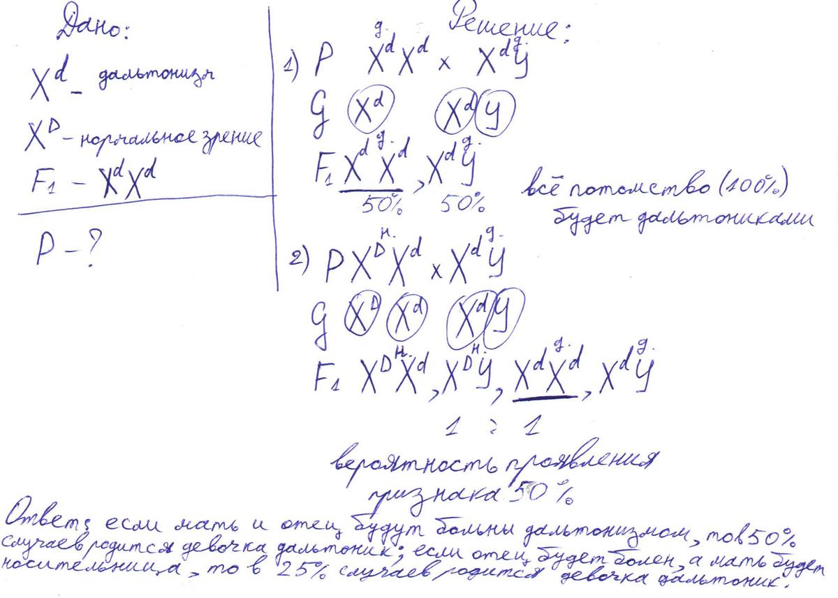 В приложенном файле все решение и ответ. Возможны 2 случая при которых может родиться больная дальтонизмом девочка.